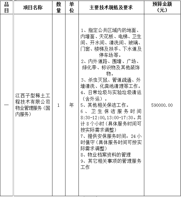 現(xiàn)就其江西離子型稀土工程技術研究有限公司物業(yè)管理服務項目進行競爭性磋商,歡迎國內(nèi)符合資格條件的響應供應商前來響應。 一、采購內(nèi)容:
